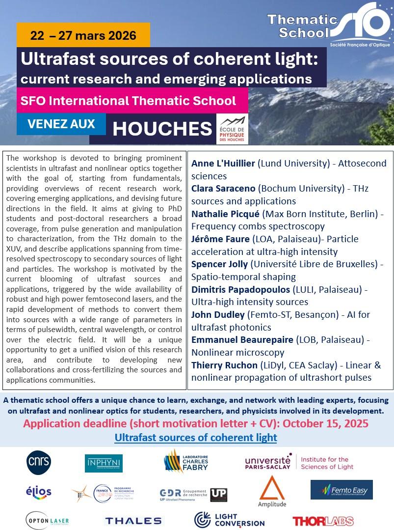 Thanks to the contributions of the lecturers, participants explored fundamental principles, discovered recent advances, and exchanged views on emerging applications, ranging from pulse generation to their characterization, and covering spectral domains from THz to XUV. Driven by the rapid development of ultrafast sources, particularly femtosecond lasers, the event provided a comprehensive overview of the field and fostered rich discussions conducive to the emergence of new collaborations.